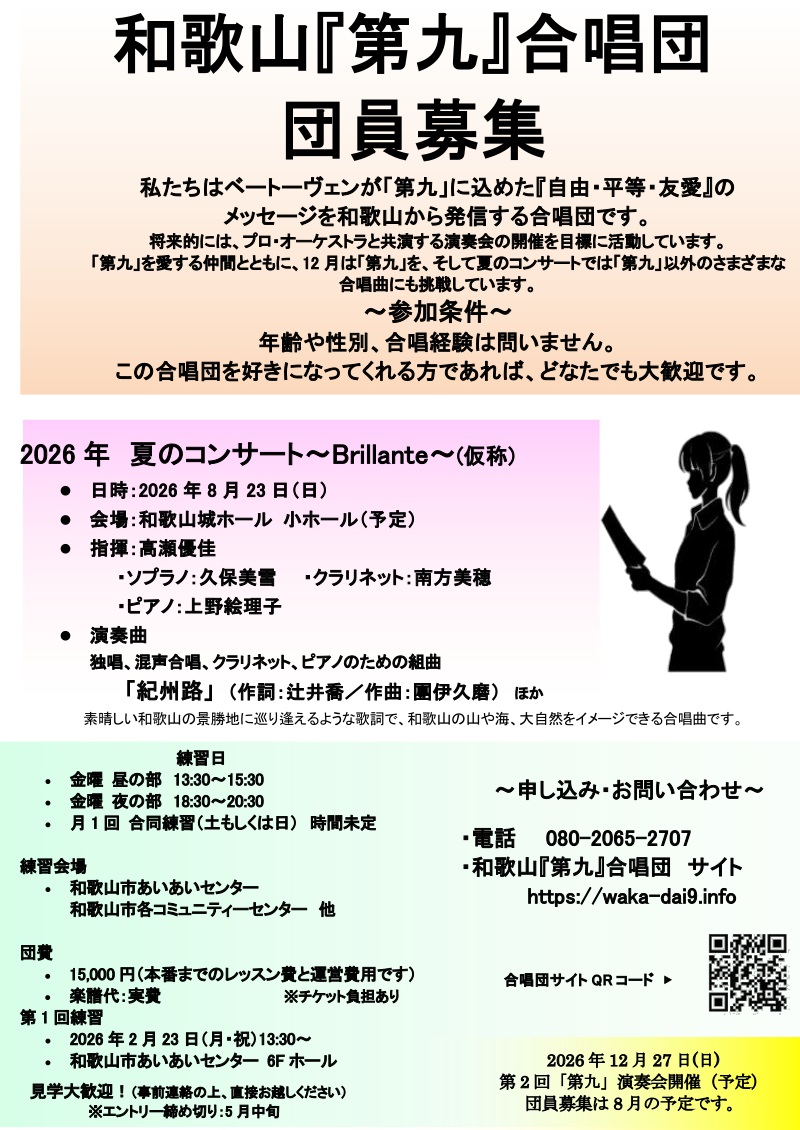 2026年 夏のコンサート ~Brillante~ (仮称) 日時:2026 年 8 月 23 日(日) 会場:和歌山城ホール 小ホール(予定) 指揮:髙瀬優佳 ・ソプラノ:久保美雪 ・クラリネット:南方美穂 ・ピアノ:上野絵理子 【演奏曲】 独唱、混声合唱、クラリネット、ピアノのための組曲 「紀州路」 (作詞:辻井喬/作曲:團伊久磨) ほか
