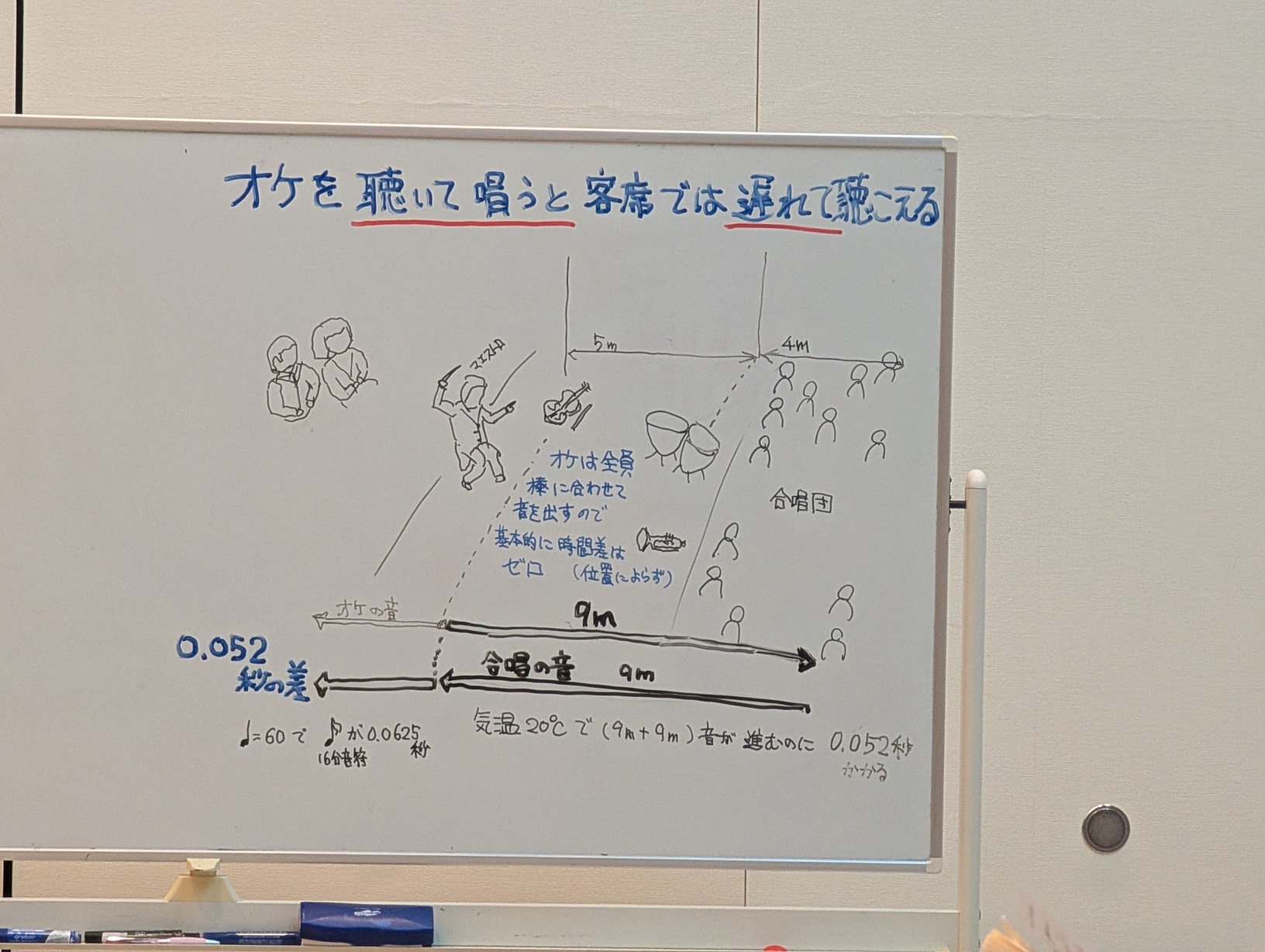 男声のOさんがささっとホワイトボードに書いてくれた物理学的な音の伝わり方と指揮を見て歌わないといけない本当の理由!